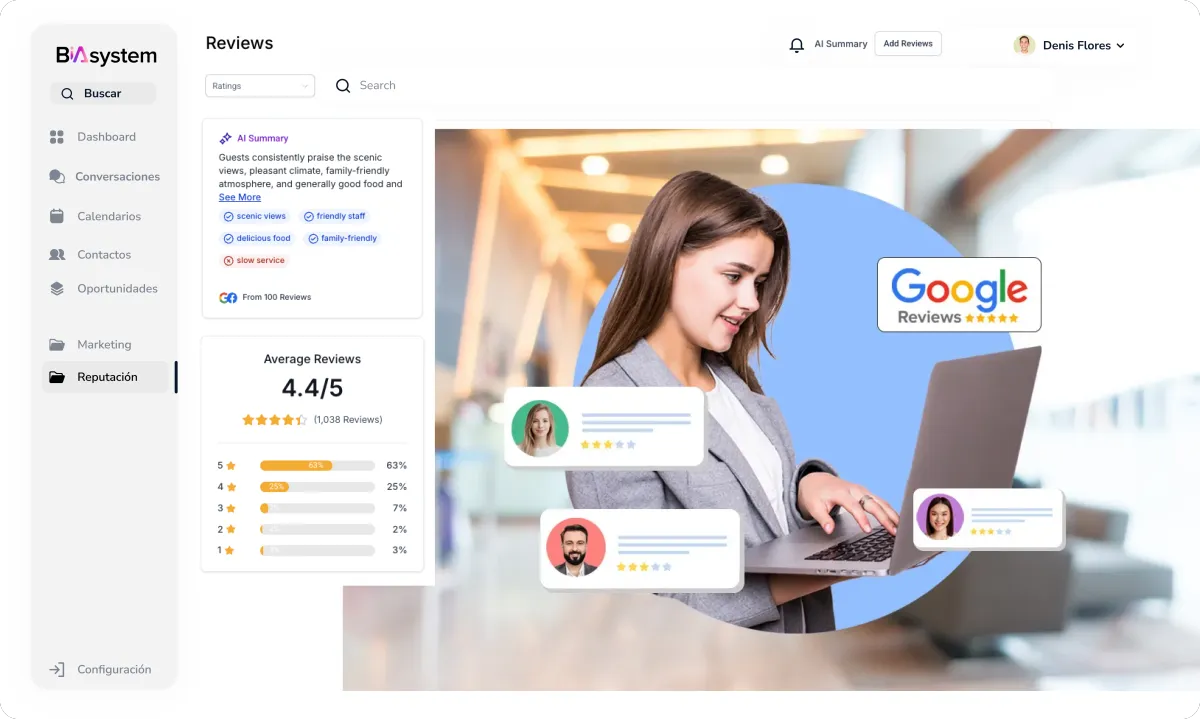 Con nuestro sistema, aumenta tus reseñas positivas y deja las negativas para control interno. Las reseñas de 4-5 estrellas se van directo a tu perfil de negocios de Google, y las menores de 3 estrellas quedan para manejo interno del equipo.