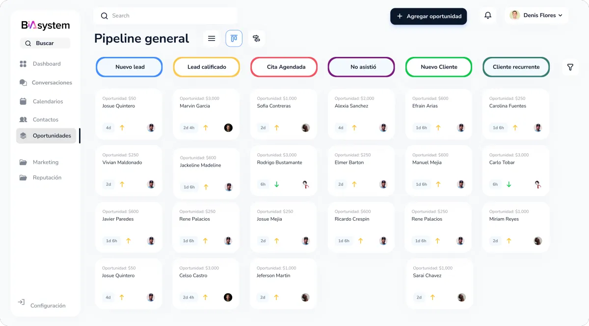 Accede a cada detalle de tus prospectos en un embudo visual diseñado estratégicamente. Clasifica a tus contactos con un solo clic y asegúrate de que ninguna oportunidad se pierda en el olvido